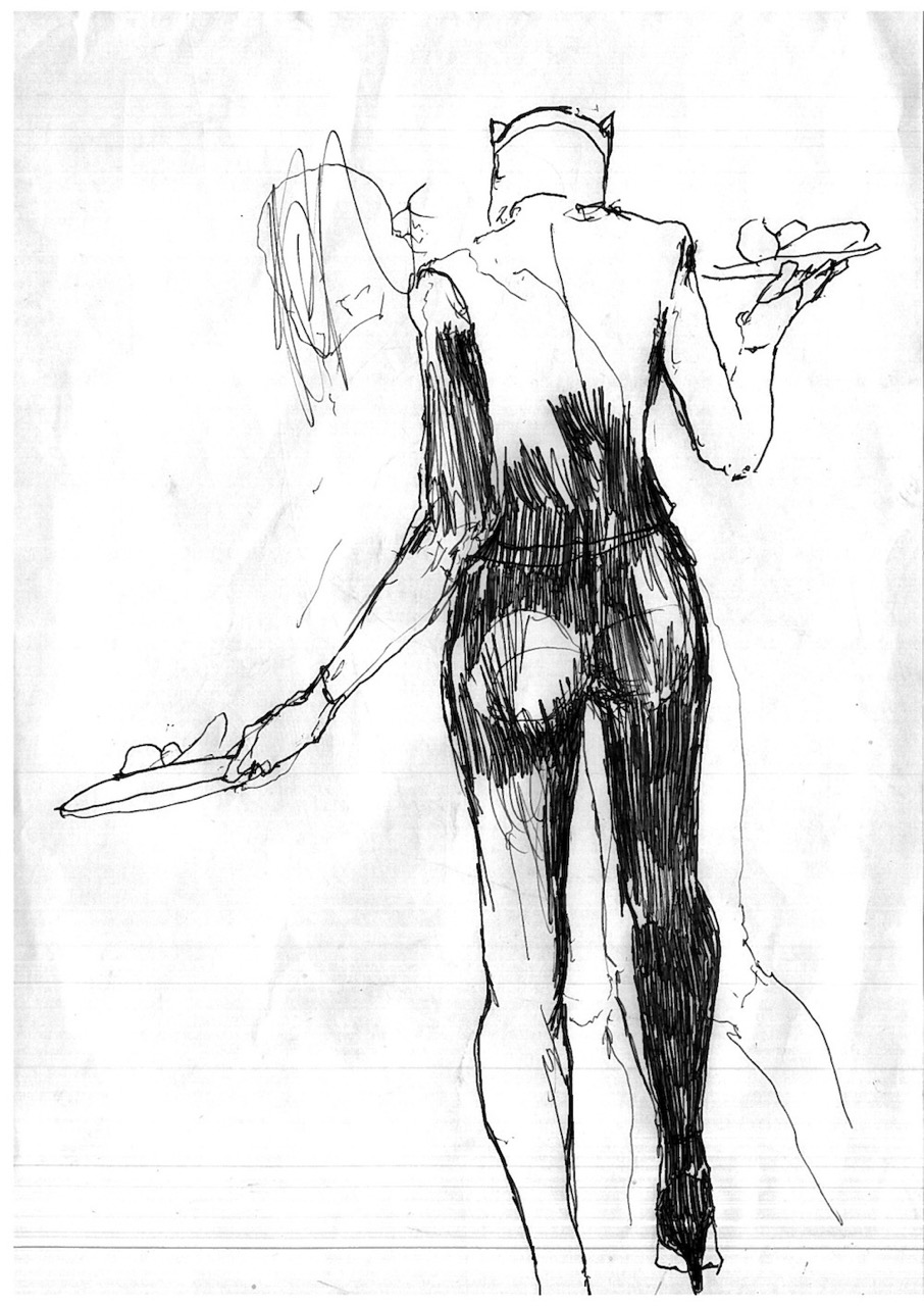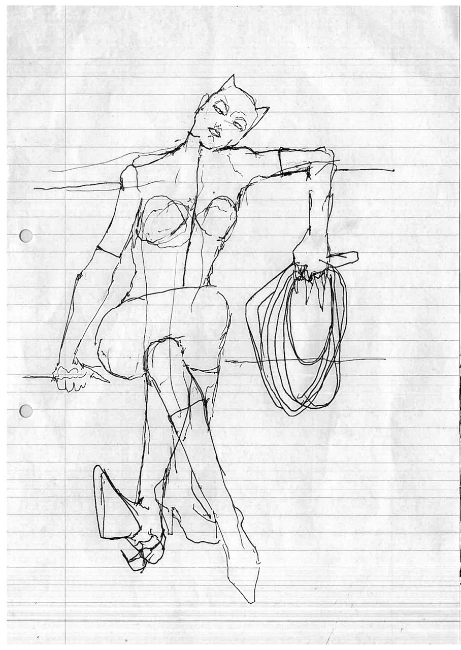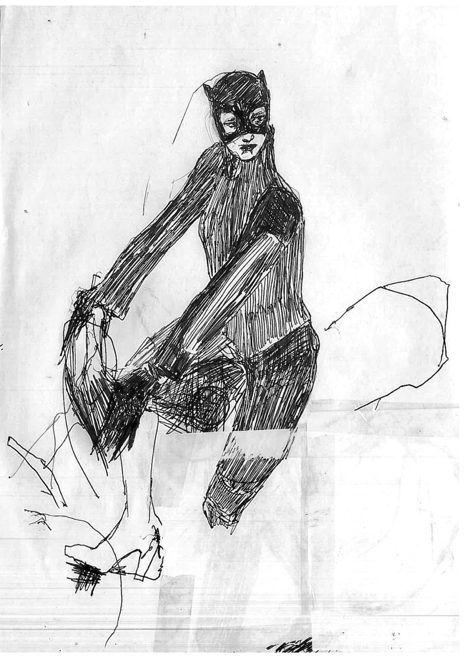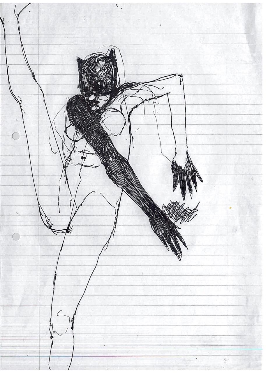 This body of 100 drawings is shown in the red light district of a city. An urban area where the revised original 1987 Catwoman, and countless other women, have their first well paid adult job. Through the drawings, a woman- who we can assume to be Catwoman- is seen busy with different activities, working towards an outcome that remains unclear. It is also unclear whether this figure is the same woman, or even the same character- but we trust it is catwoman by what she is wearing. What is very clear throughout though, is that she is always on her own. 100 depictions of a woman’s labour, jouissance and defence against unseen aggressors are ink drawn on A4 office paper.
